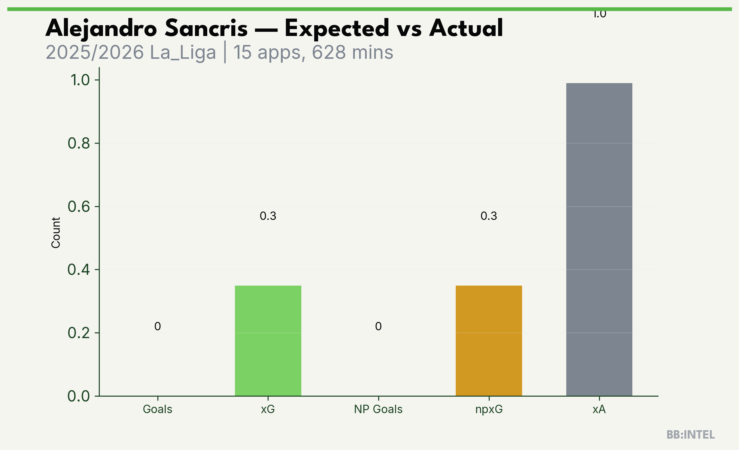 | 2025/2026 | La_Liga | 15 | 0 | 0.3 | 1.0 | 11 | -0.3 |
