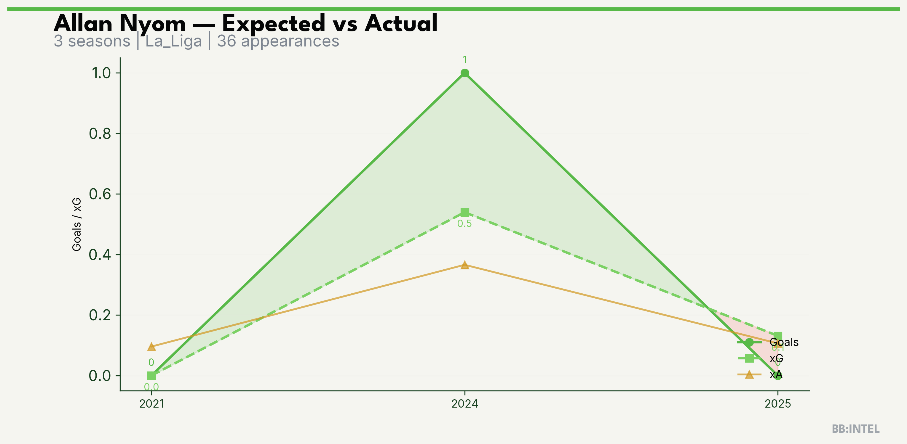 | 2024/2025 | La_Liga | 20 | 1 | 0.5 | 0.4 | 9 | +0.5 |
