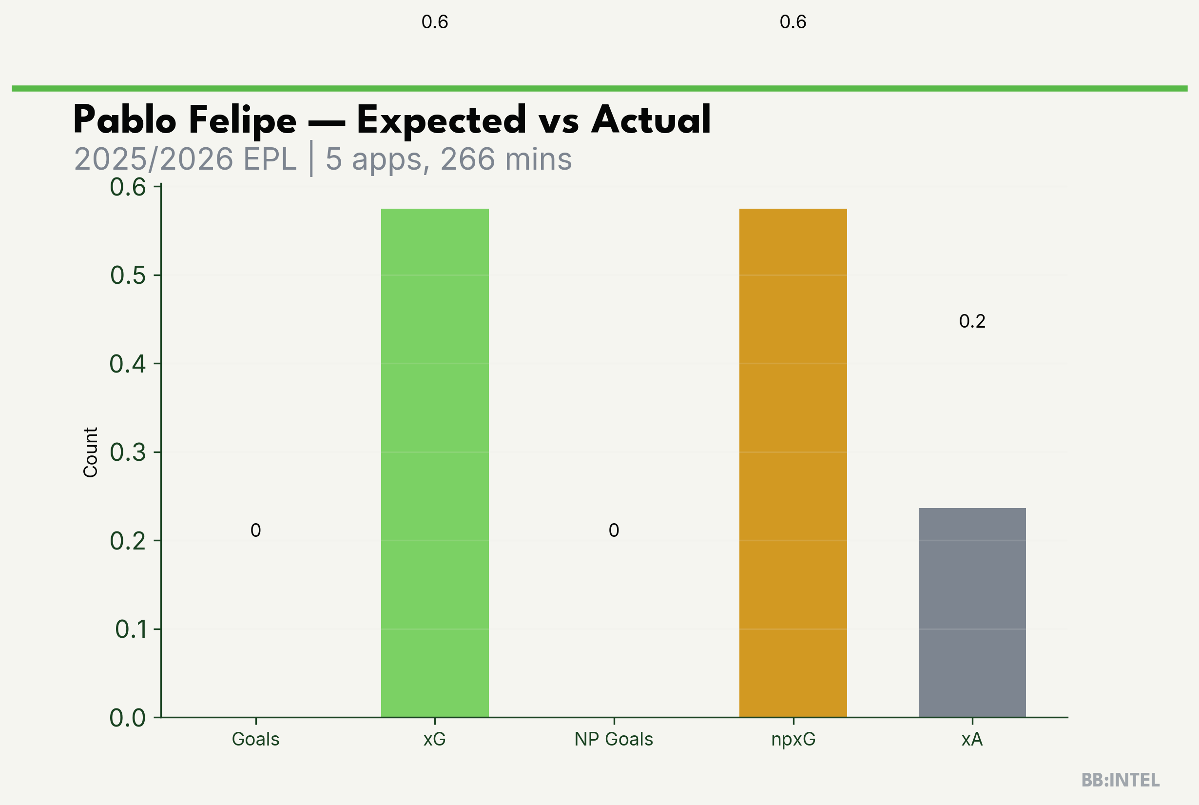 | 2025/2026 | EPL | 5 | 0 | 0.6 | 0.2 | 4 | -0.6 |