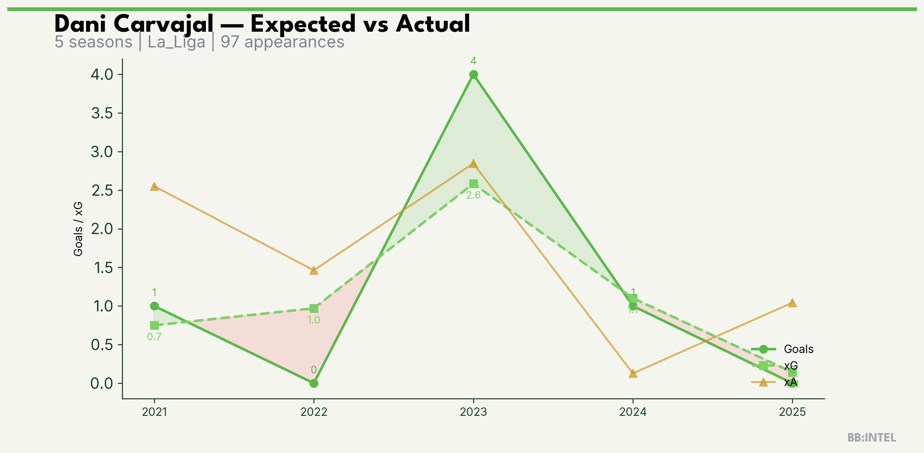 | 2023/2024 | La_Liga | 28 | 4 | 2.6 | 2.8 | 18 | +1.4 |
