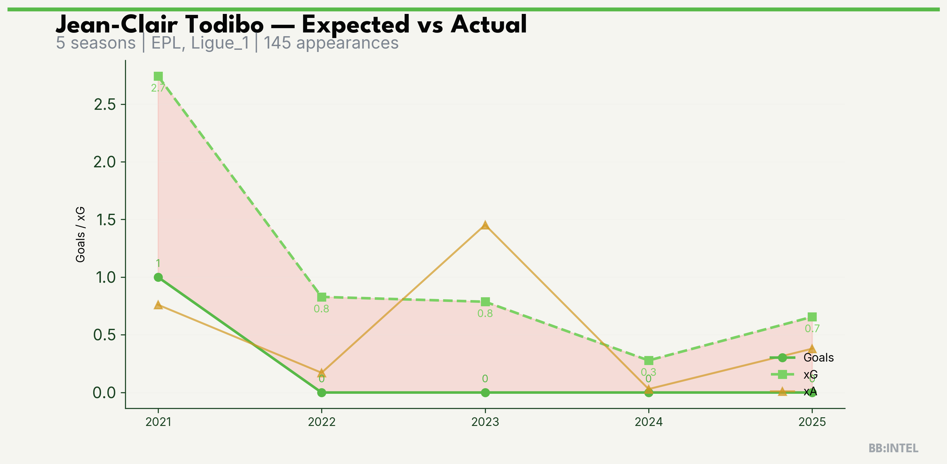 | 2025/2026 | EPL | 19 | 0 | 0.7 | 0.4 | 2 | -0.7 |