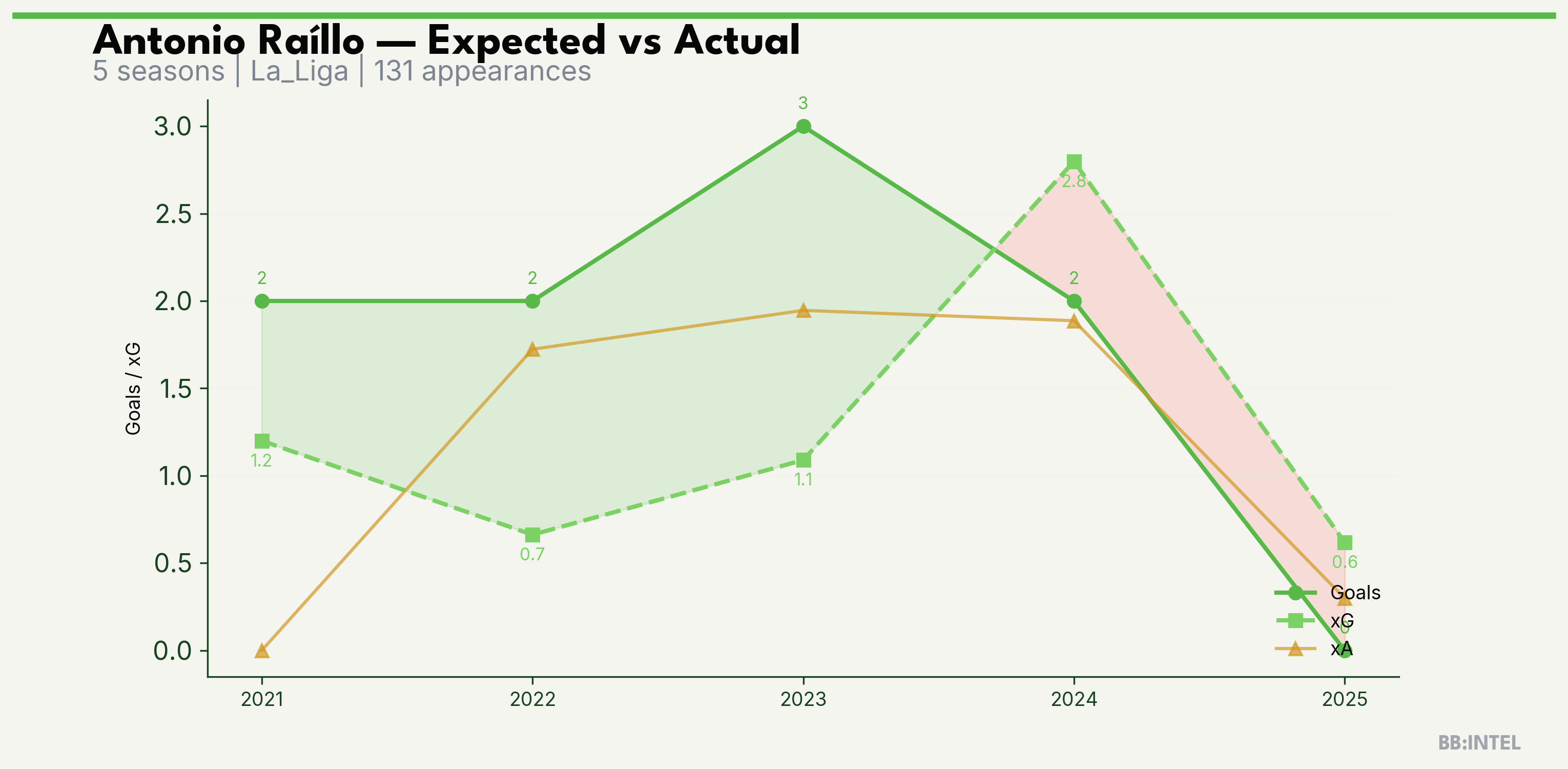 | 2024/2025 | La_Liga | 36 | 2 | 2.8 | 1.9 | 35 | -0.8 |