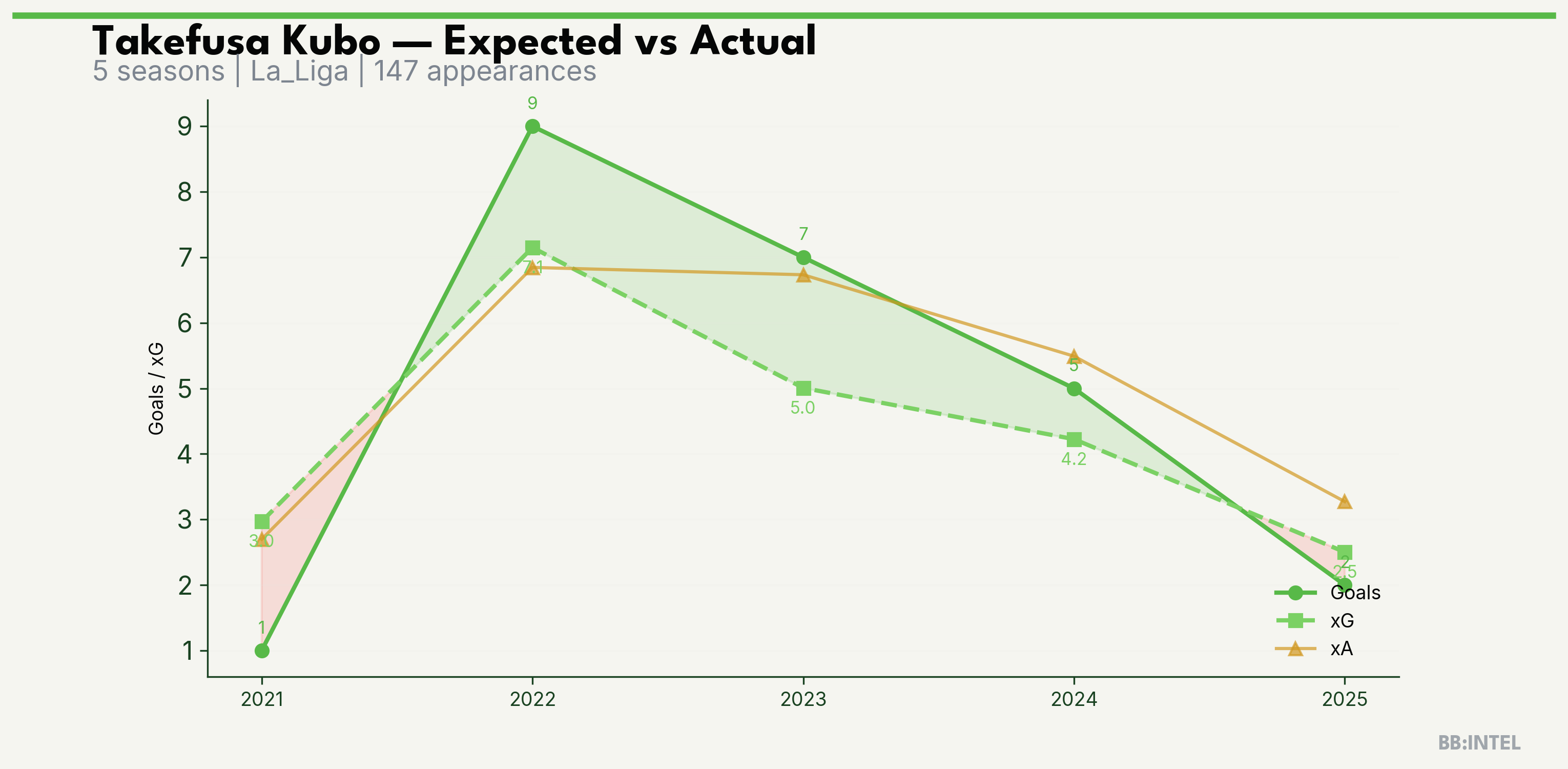 | 2022/2023 | La_Liga | 35 | 9 | 7.1 | 6.8 | 72 | +1.9 |