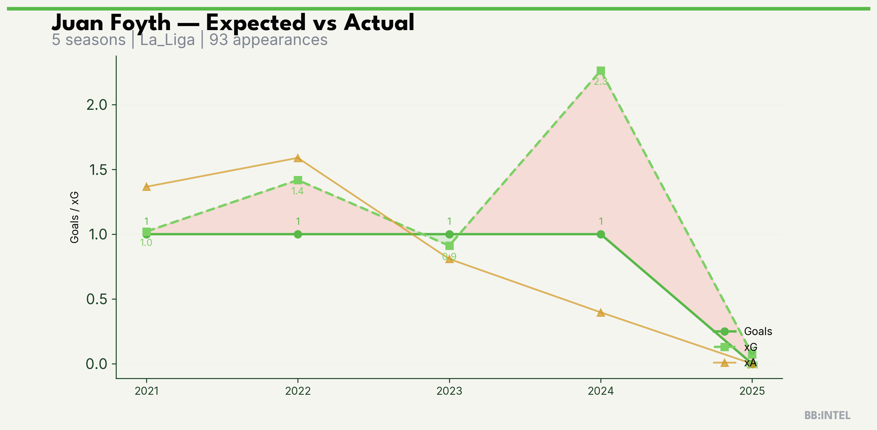 | 2024/2025 | La_Liga | 19 | 1 | 2.3 | 0.4 | 17 | -1.3 |