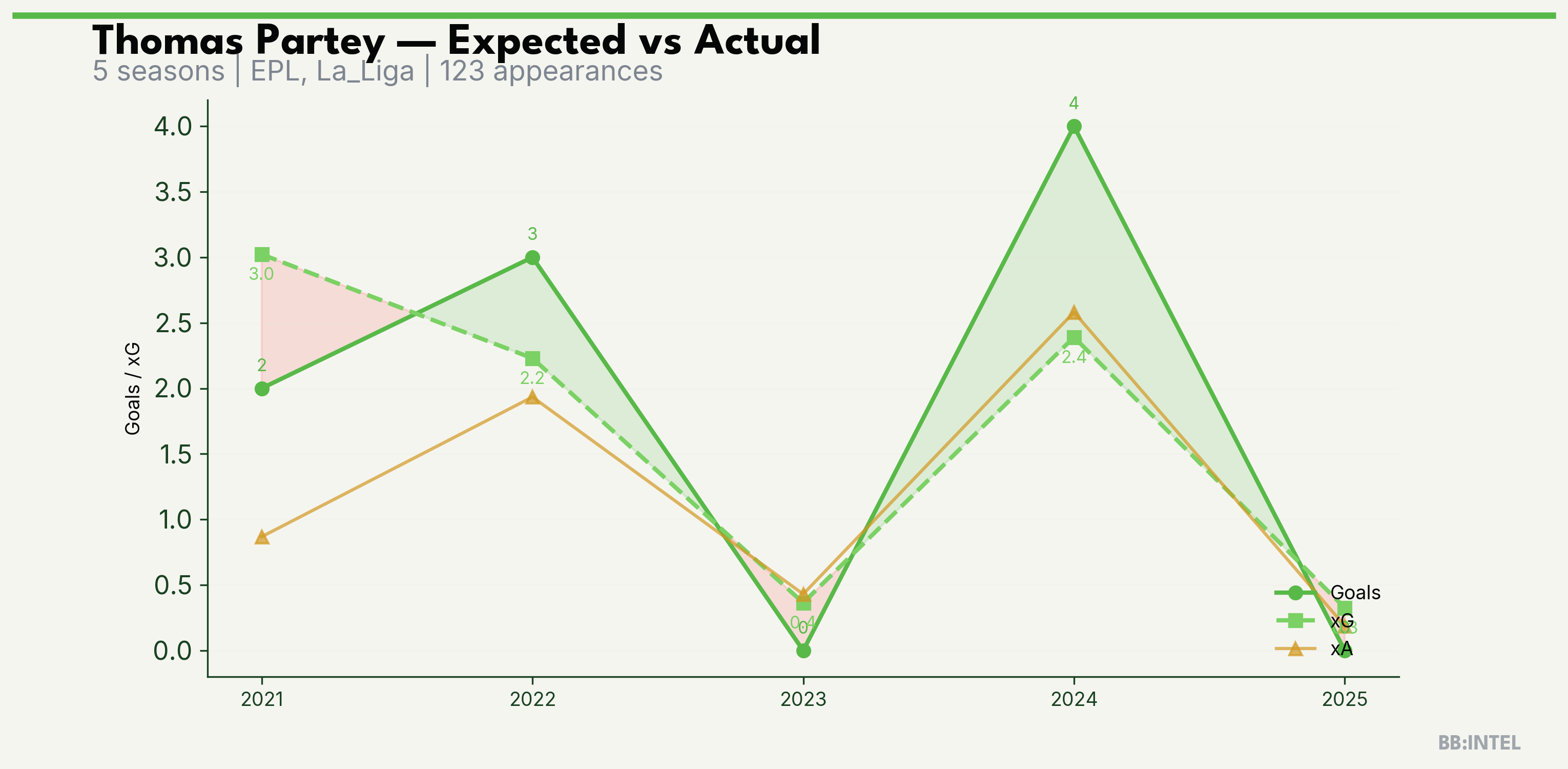 | 2024/2025 | EPL | 35 | 4 | 2.4 | 2.6 | 26 | +1.6 |