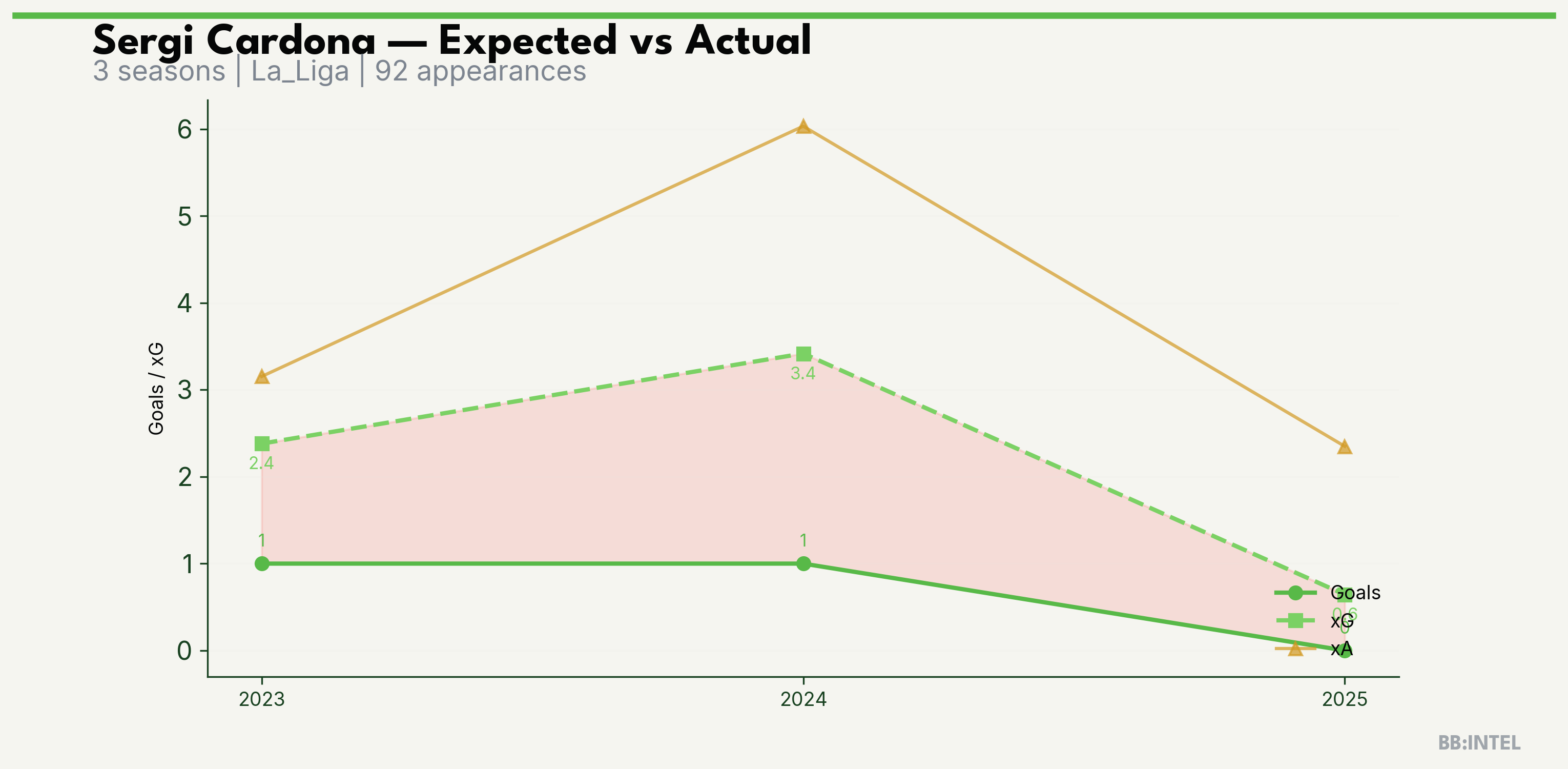 | 2025/2026 | La_Liga | 22 | 0 | 0.6 | 2.4 | 12 | -0.6 |