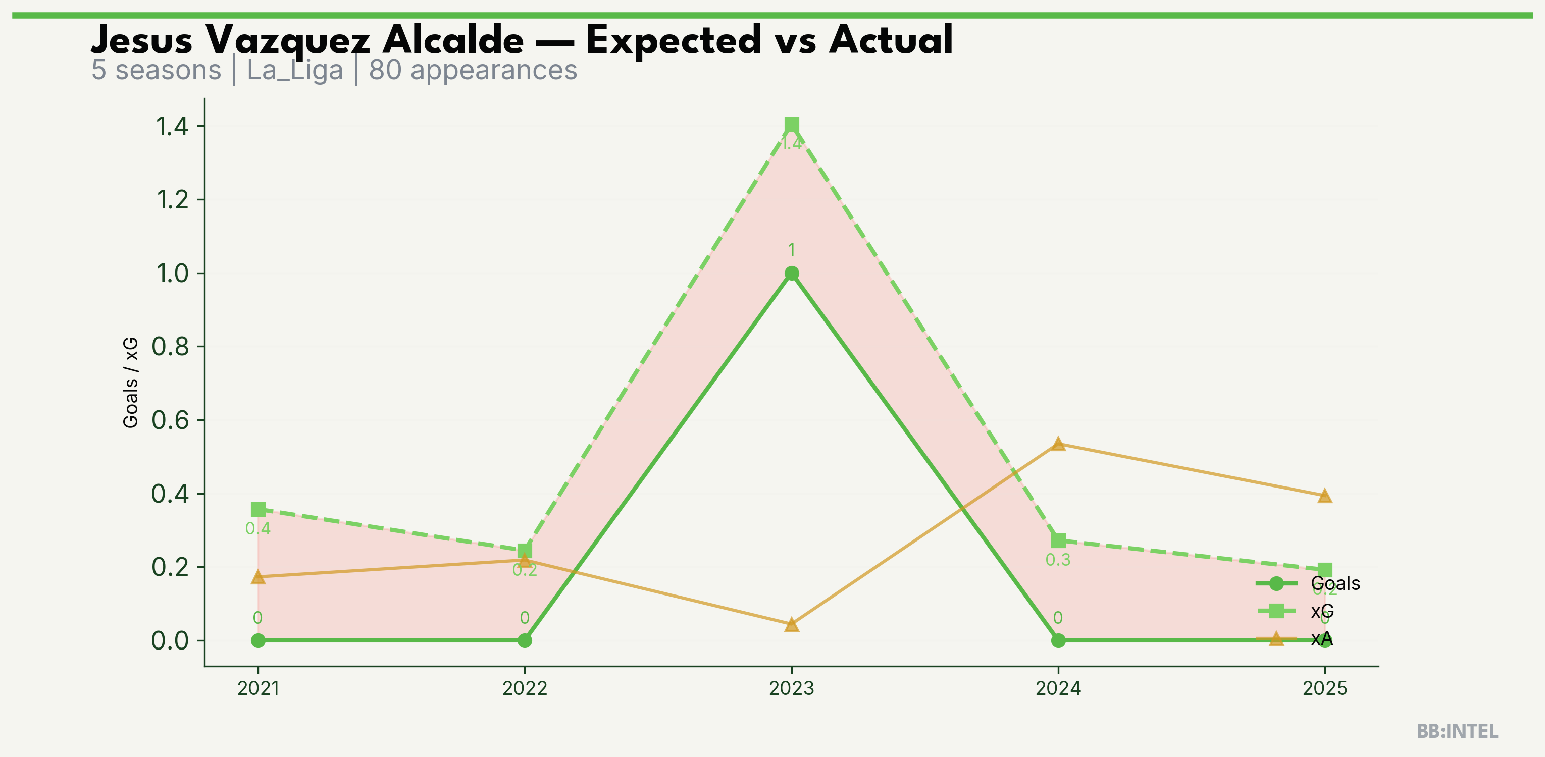 | 2023/2024 | La_Liga | 20 | 1 | 1.4 | 0.0 | 7 | -0.4 |