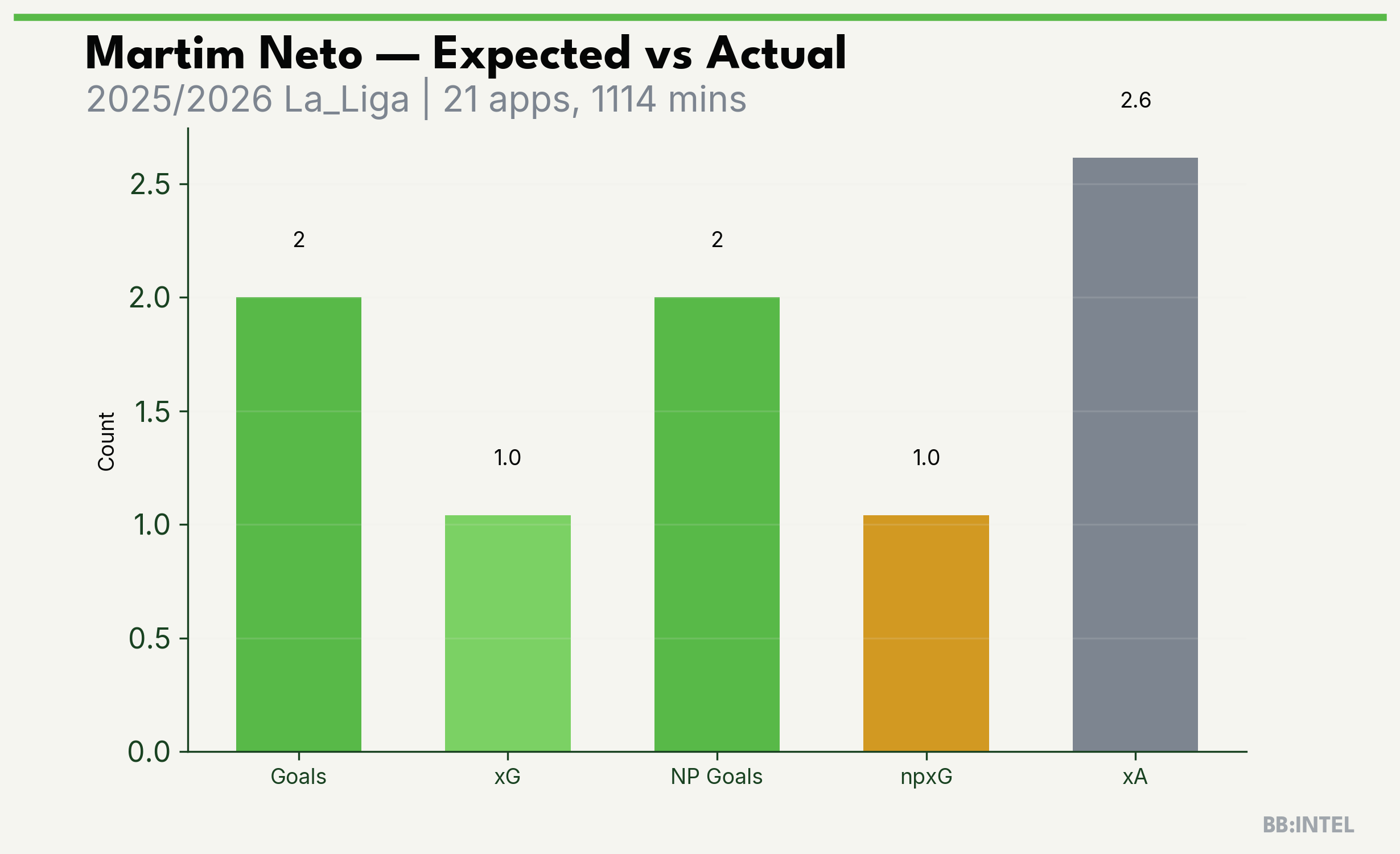 | 2025/2026 | La_Liga | 21 | 2 | 1.0 | 2.6 | 12 | +1.0 |