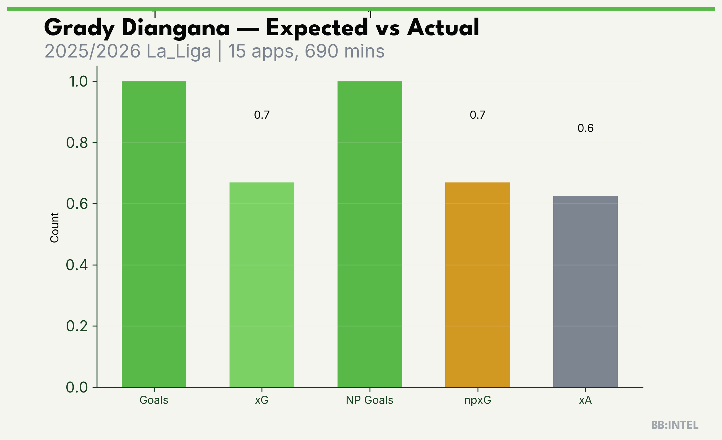 | 2025/2026 | La_Liga | 15 | 1 | 0.7 | 0.6 | 12 | +0.3 |
