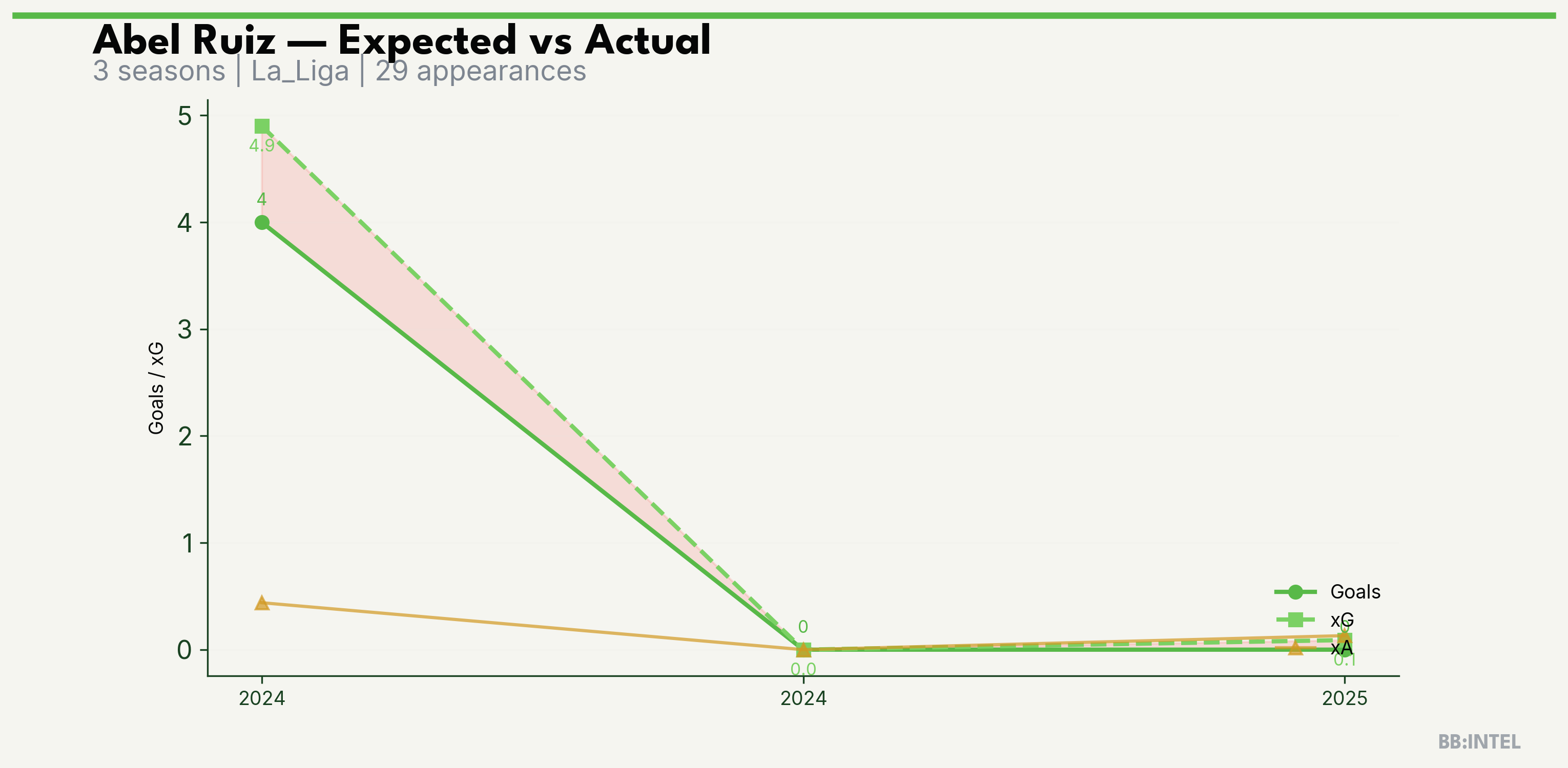 | 2024/2025 | La_Liga | 23 | 4 | 4.9 | 0.4 | 23 | -0.9 |