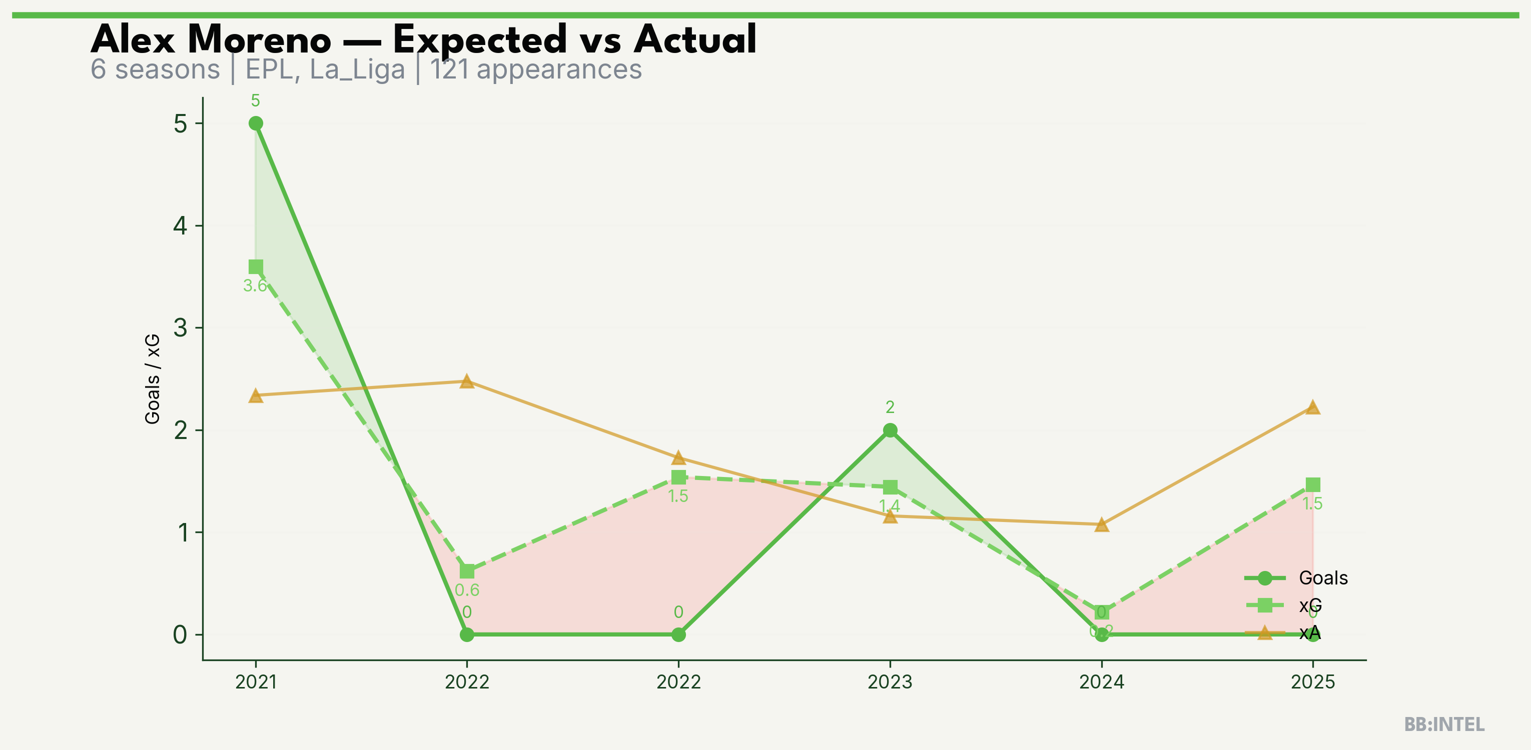 | 2025/2026 | La_Liga | 21 | 0 | 1.5 | 2.2 | 15 | -1.5 |
