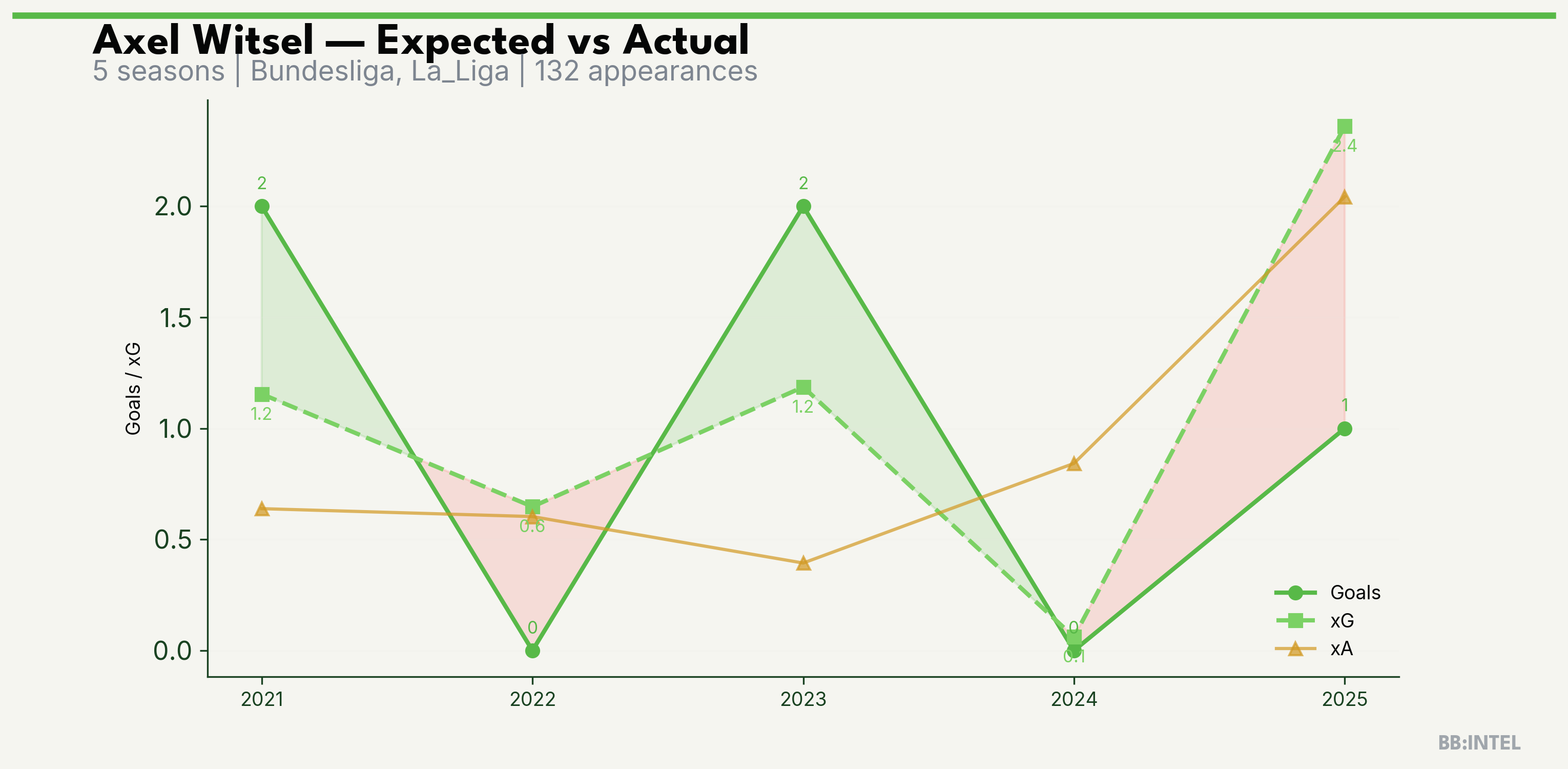 | 2025/2026 | La_Liga | 21 | 1 | 2.4 | 2.0 | 18 | -1.4 |
