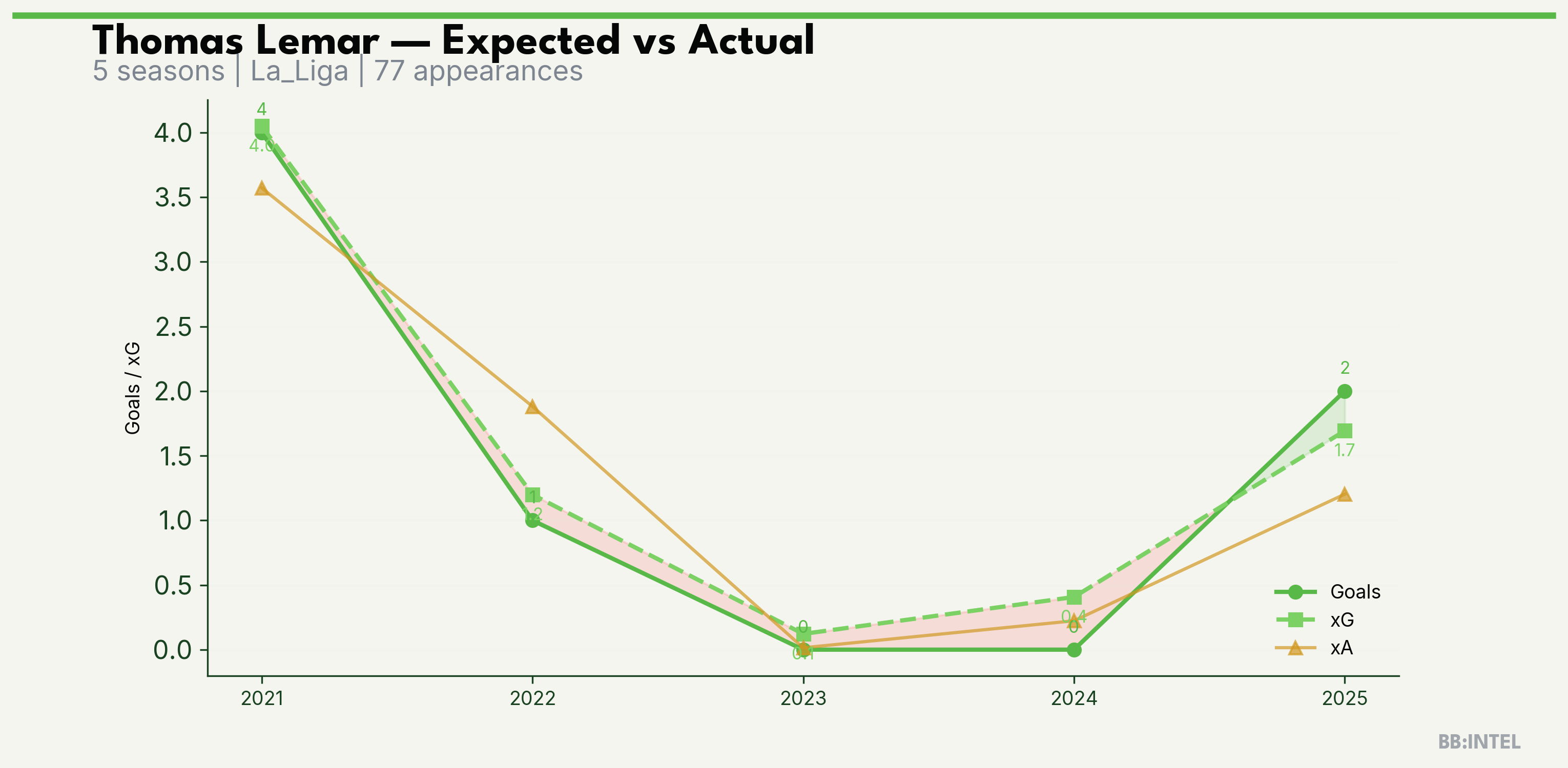 | 2024/2025 | La_Liga | 5 | 0 | 0.4 | 0.2 | 2 | -0.4 |