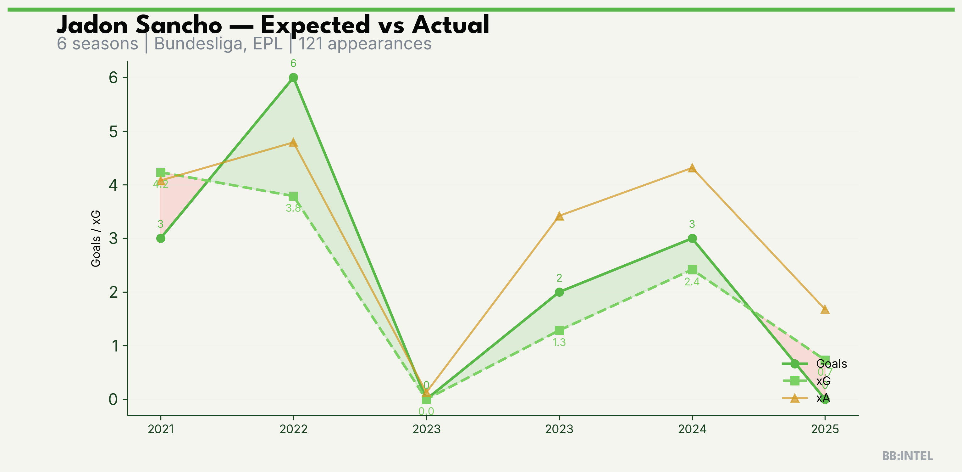 | 2022/2023 | EPL | 26 | 6 | 3.8 | 4.8 | 21 | +2.2 |