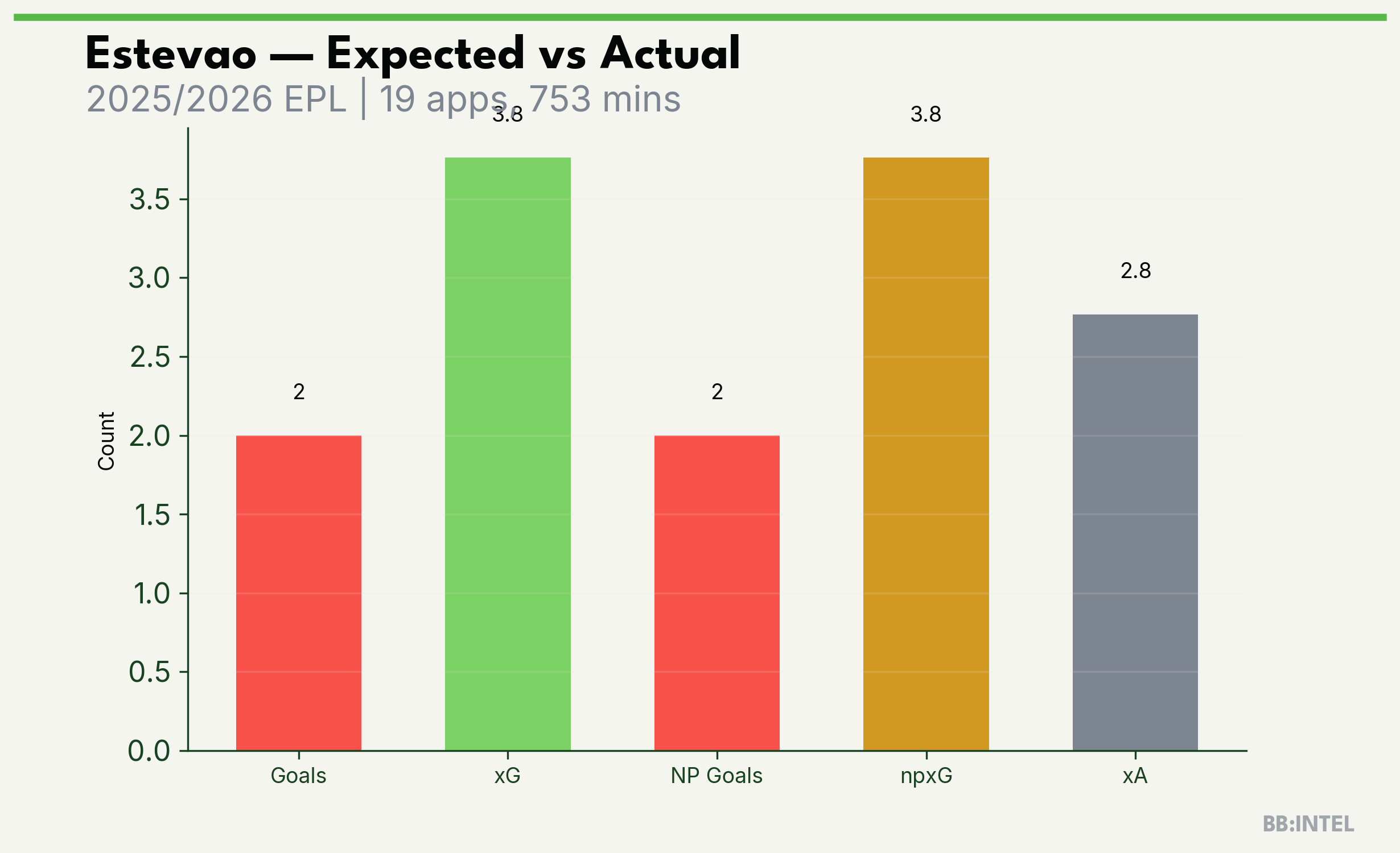 | 2025/2026 | EPL | 19 | 2 | 3.8 | 2.8 | 26 | -1.8 |