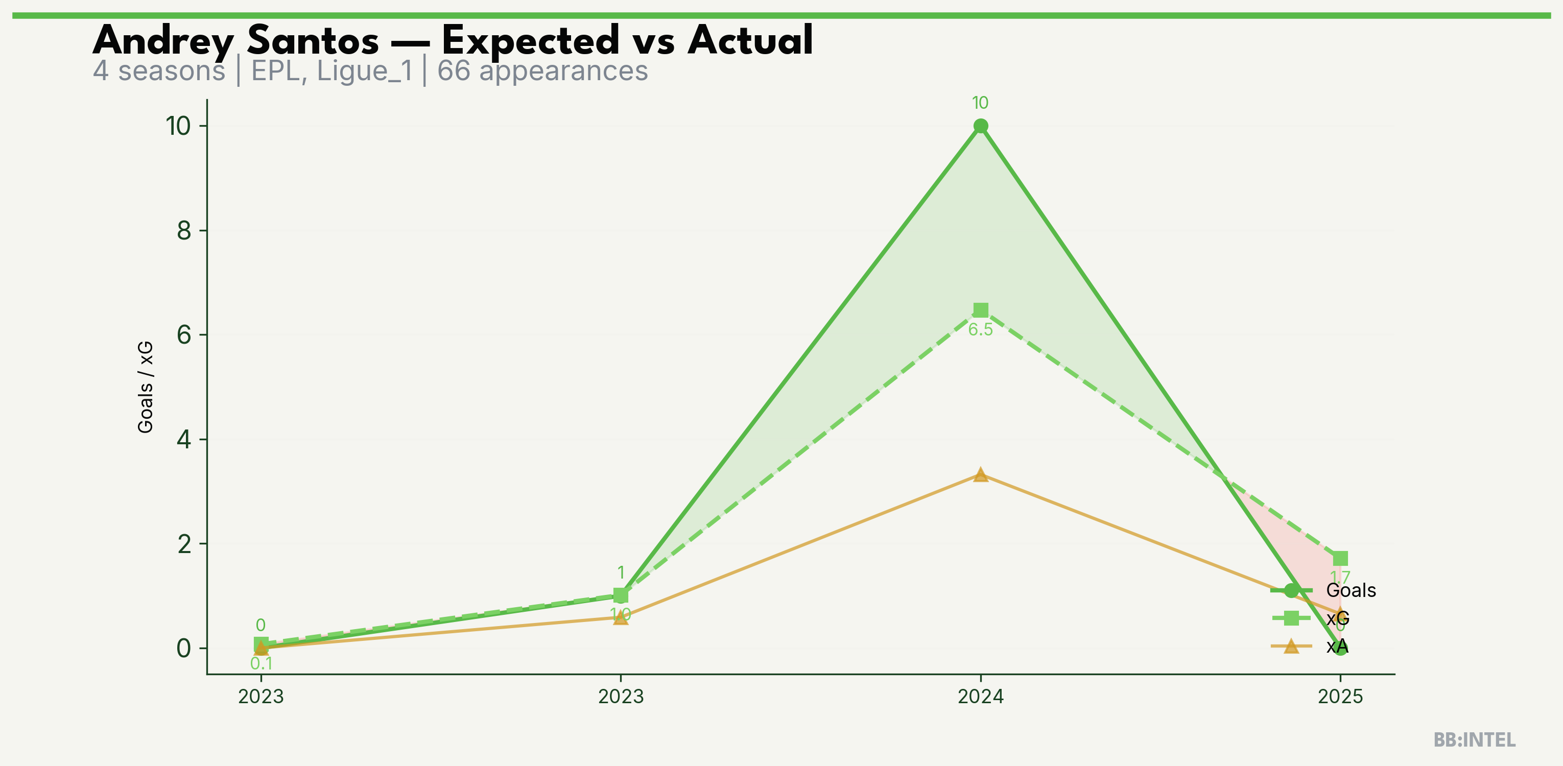 | 2025/2026 | EPL | 22 | 0 | 1.7 | 0.7 | 8 | -1.7 |