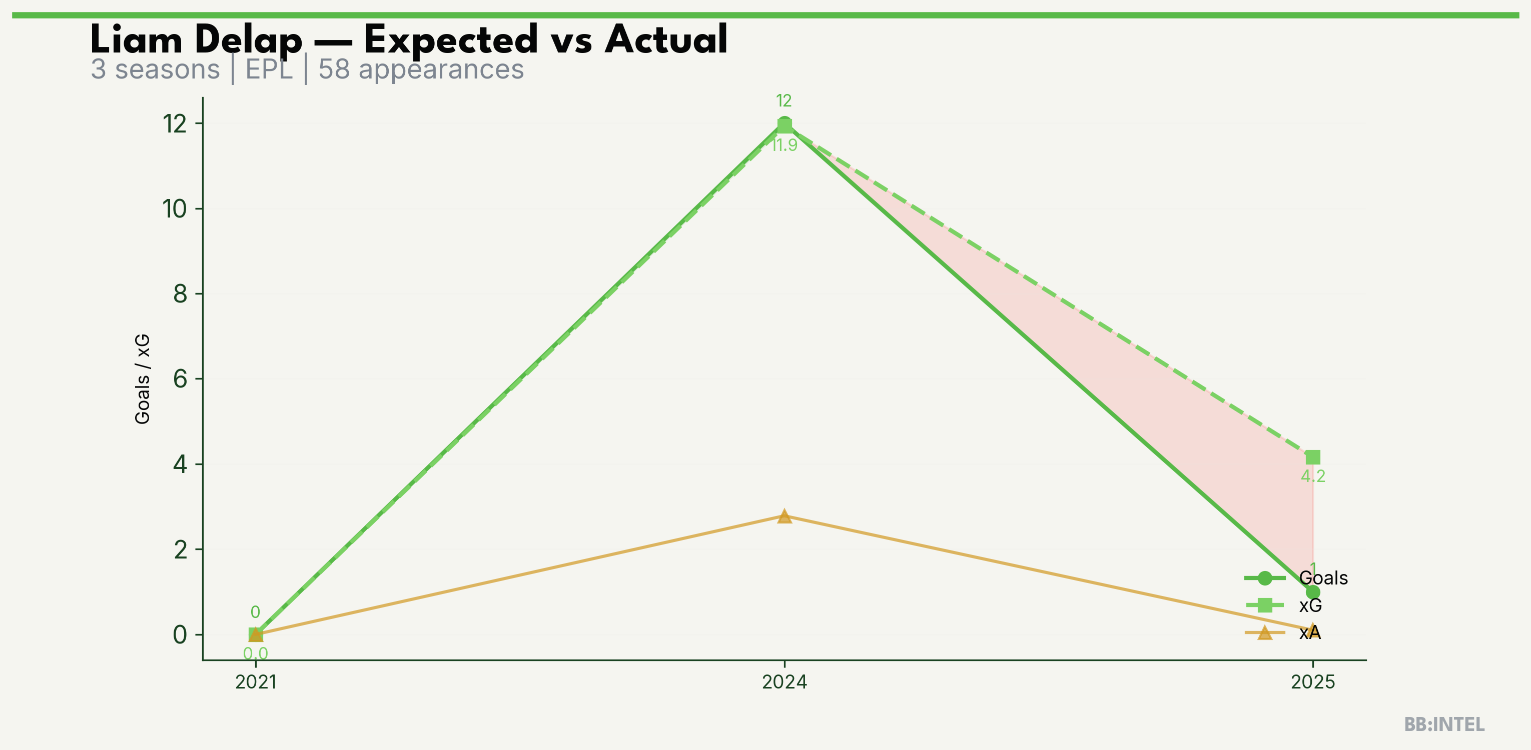 | 2025/2026 | EPL | 20 | 1 | 4.2 | 0.1 | 27 | -3.2 |